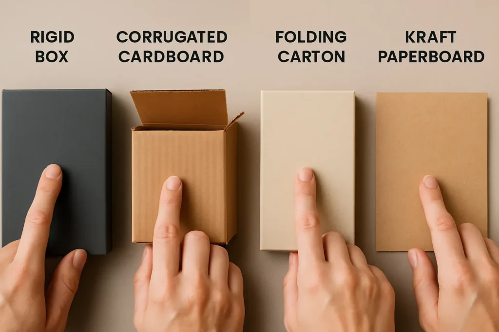 Cardboard, kraft paper, and rigid board are popular choices. Your selection depends on the product’s weight, branding style, and budget.